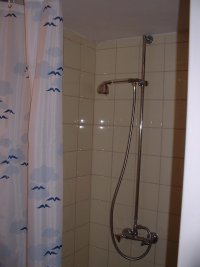 Auf derselben Etage befindet sich WC mit Dusche. Die Warmwasserversorgung ist durch einen Elektroboiler sichergestellt. Die Dusche wird mit einem Heizstrahler beheizt.