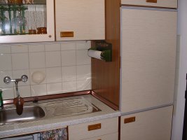 Die Küche verfügt über einen Elektroherd mit Backofen, einen Kühschrank mit Gefrierfach sowie über eine Kaffeemaschine, Wasserkocher, Eierkocher als auch einen Toaster.