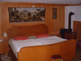 Im Untergeschoss befindet sich ein gemütlicher Schlafraum mit einem Doppelbett und einer Schlafcouch für eine Person. Dieser Raum wird mit einem Ölofen beheizt. Eine Außentür führt auf eine schöne Terasse, die sich im Sommer auch zum Grillen eignet.