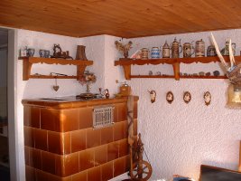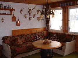 Der Wohnraum, im Stil einer Jägerstube, wird über einen Kachelofen beheizt. Für gemütliche Abende stehen etwas Literatur als auch Gesellschaftsspiele zur Verfügung.
